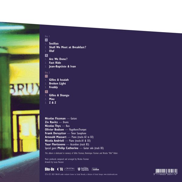 Voici les musiciens m’accompagnant dans cette aventure : Olivier Bodson au bugle et à la trompette, Frank Deruytter au saxophone ténor, Arnould Massart au piano, Ziv Ravitz à la batterie, Nicolas Thys à la basse, Nicola Andrioli au piano, Tuur Florizoone à l’accordéon et mon invité spécial Philip Catherine en solo de guitare sur un des titres que forment ce premier album éponyme.” – Nicolas Fiszman